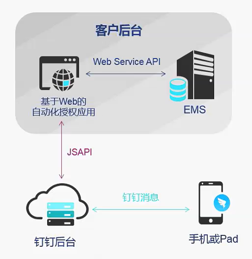 授权审批的流程原本要使用钉钉,但问题在于钉钉与授权服务器(EMS)不能通信。授权请求得到批准以后,仍需要一个专门的授权操作人员上手动创建授权。针对客户的需求,我们为他们设计了一个自动化授权方案。